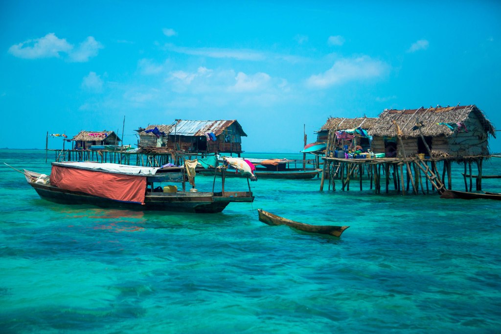 A blue, cloudless sky. The limpid Sulu Sea. Wooden huts hovering over the water on stilts. Narrow, handmade canoes docked in front of each. In the hull of an indigenous lepa-lepa boat, a woman cooks a fish over an open fire. Children paddle between the huts in their own canoes. A young woman washes clothes and hangs them out to dry on a clothesline strung across a hut’s tiny front porch. An older man plays with a little child and laughs.